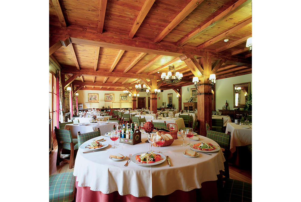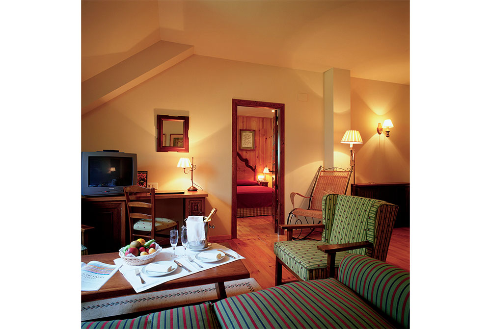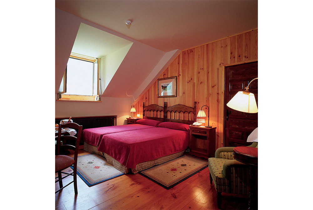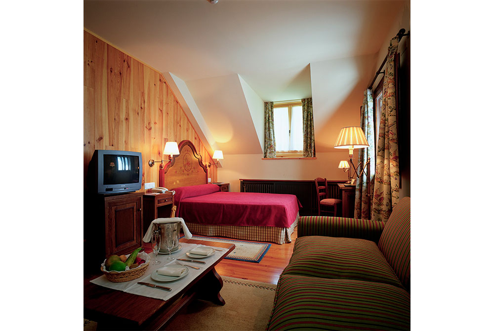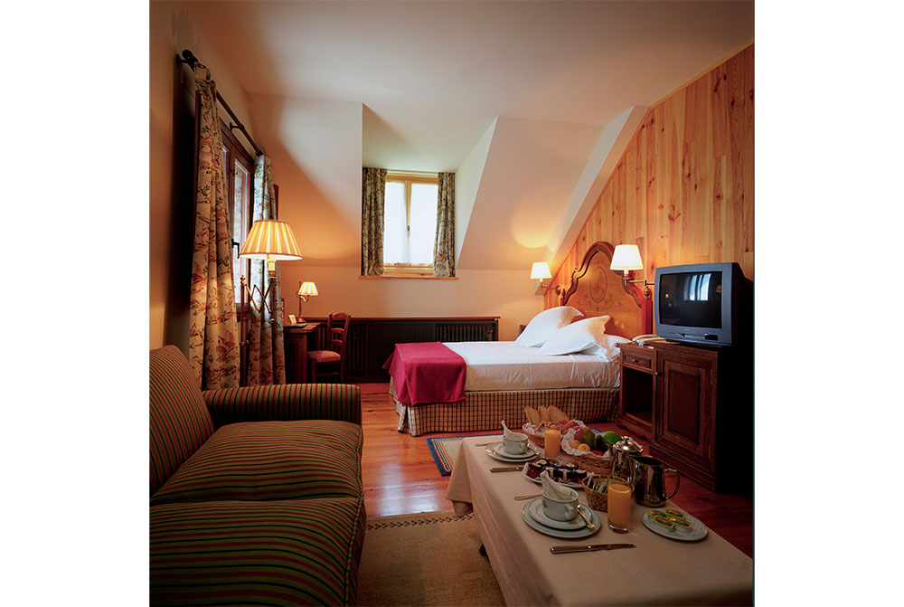 石造り、黒のスレート葺きの4階建てのパラドールは、外観こそ派手さはありませんが、館内の設備はさすがにパラドールです。自然の雰囲気を大切にし、内装は木材を使用した温かい雰囲気が漂うインテリアでまとめられています。窓は少し小さめで保温のため二重窓になっていますが、窓を開ければピレネーの山並みとシンカ川が眺められ、冷たい澄んだ空気が頬に心地よく触れます。