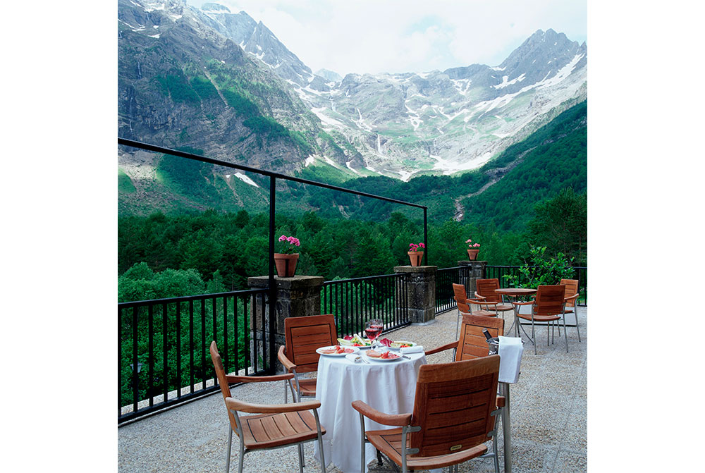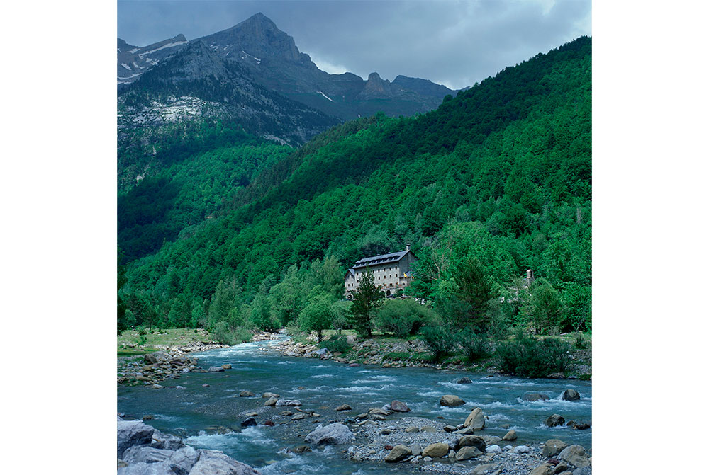 ピレネーの山奥の小さな村ビエルサからさらに15km、シンカ川に沿って登るとオルデサ国立公園の入口に建つ、こじんまりとした山小屋風のパラドールに着きます。緑深い林と清流、それに覆い被さるような雪化粧のピレネーの雄大な山並みは、日本の上高地を思い起こさせます。