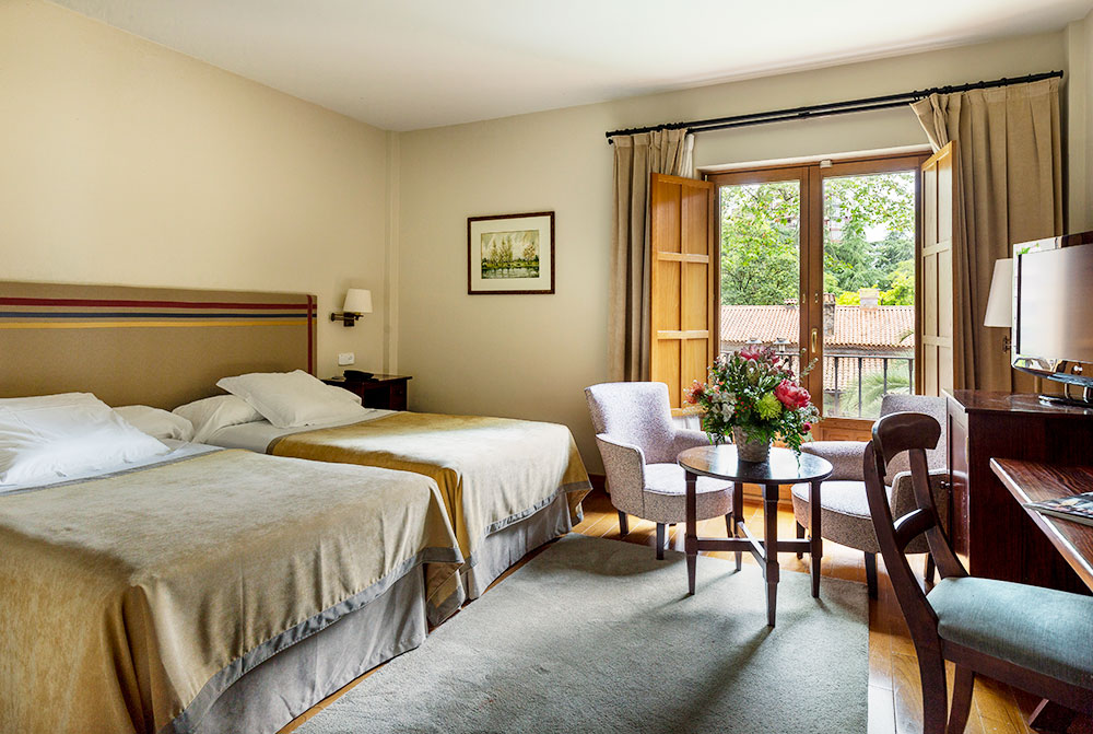 オビエドの北、コスタ・ベルデに面した港町、ヒホン。パラドールは、町外れにあるイサベラ・ラ・カトリカ公園の一画、水鳥たちが集う静かな池のかたわらに建っています。リゾートホテルのような造りで、大きな窓からは明るい光が射し込み、客室も広く、心地よい空間を作りだしています。